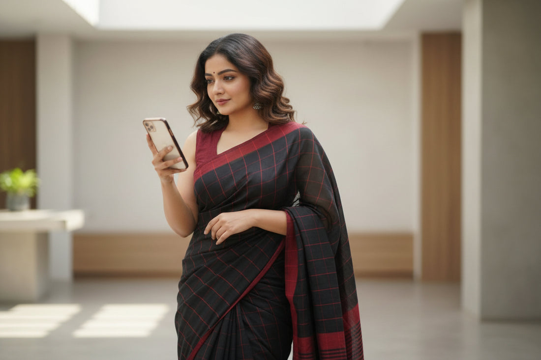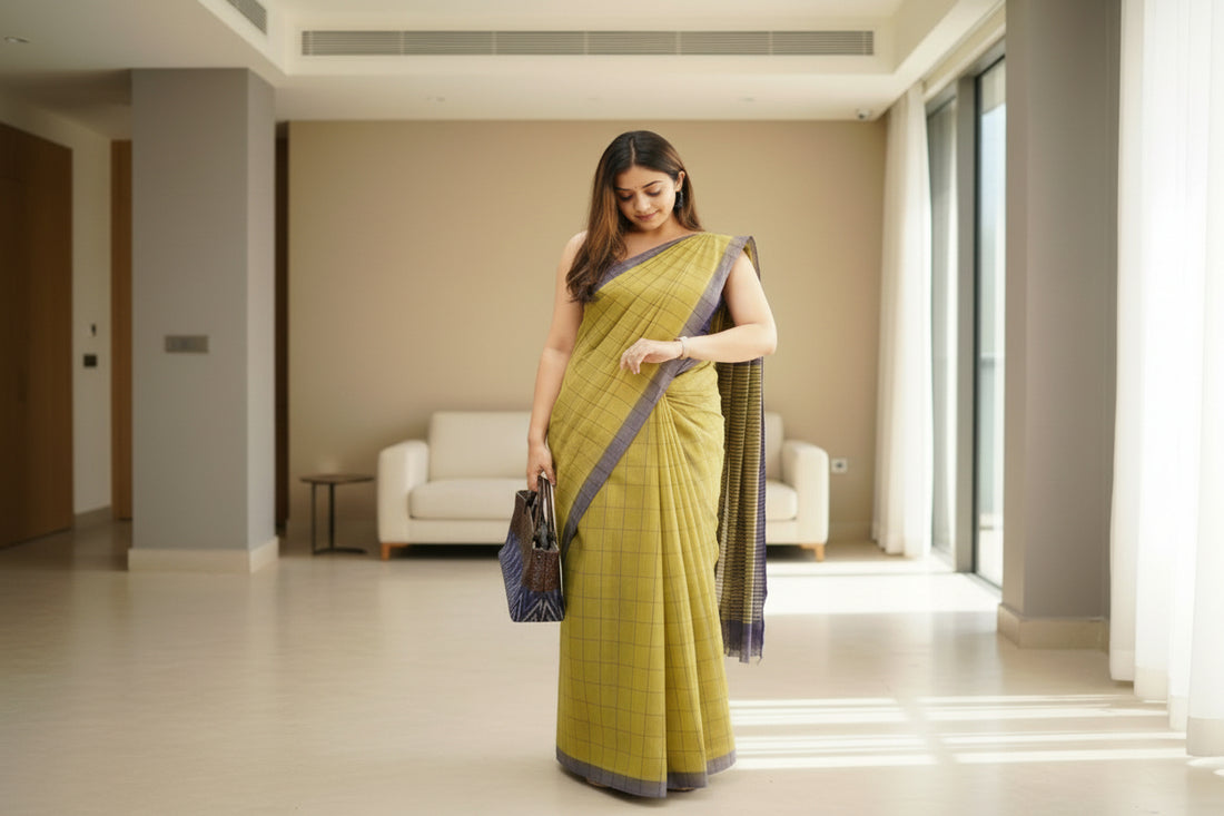 Pure Khadi cotton saree with blouse – Elegant, professional & handwoven, light weight easy to drape. Comfortable all day.