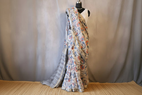 Gray Maheshwari Handloom Saree with White design and purple Silk Zari – 80% Silk, 20% Cotton (Cotton Silk) – Comes with Matching Blouse Piece -