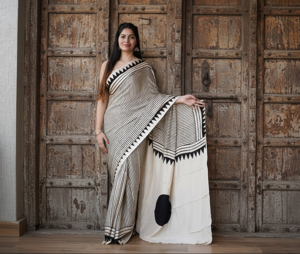 Pure Modal Silk with blouse. With Ajrak Print Lightweight, easy to drape . Comfortable all day