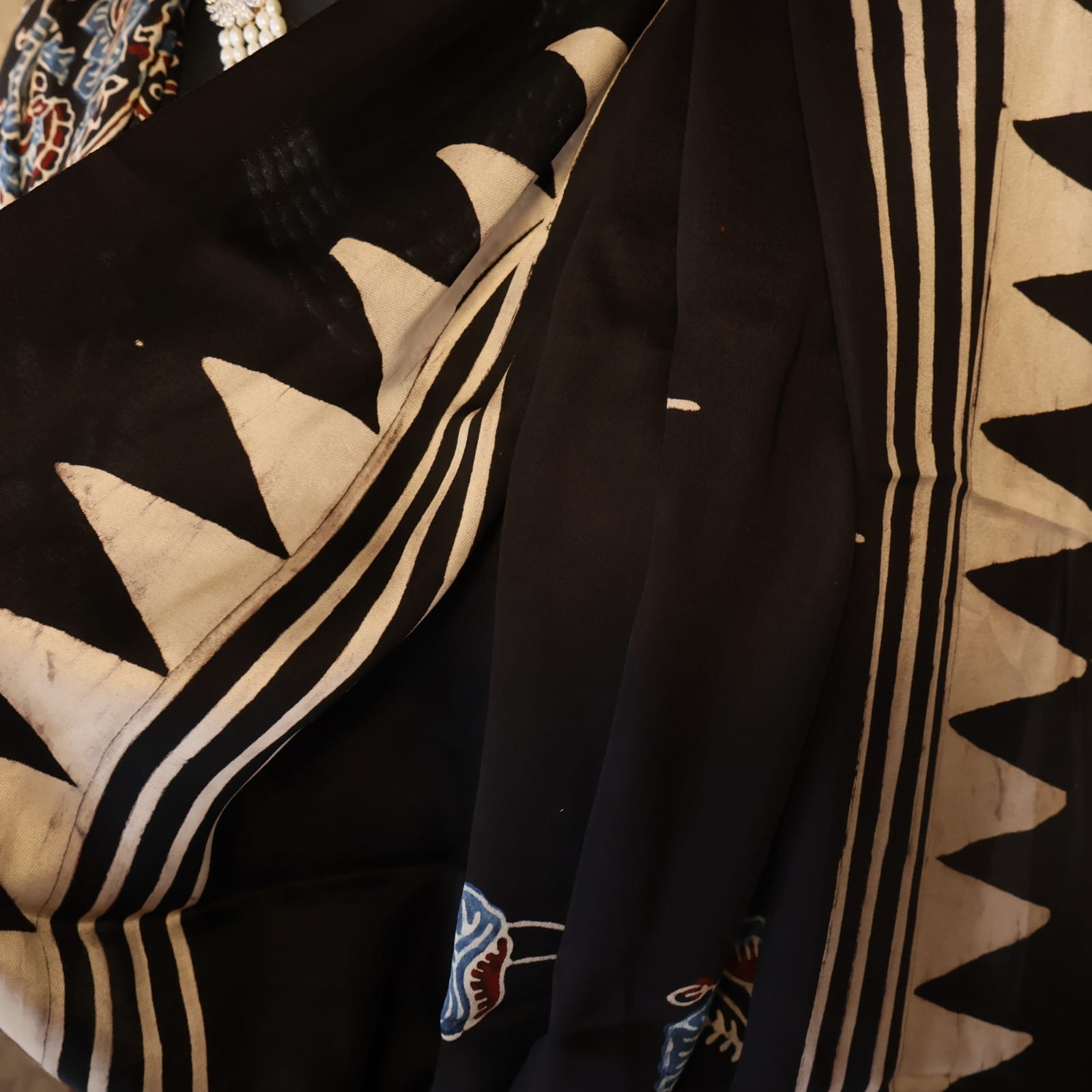 Pure Modal Silk with blouse. With Ajrak Print Lightweight, easy to drape . Comfortable all day